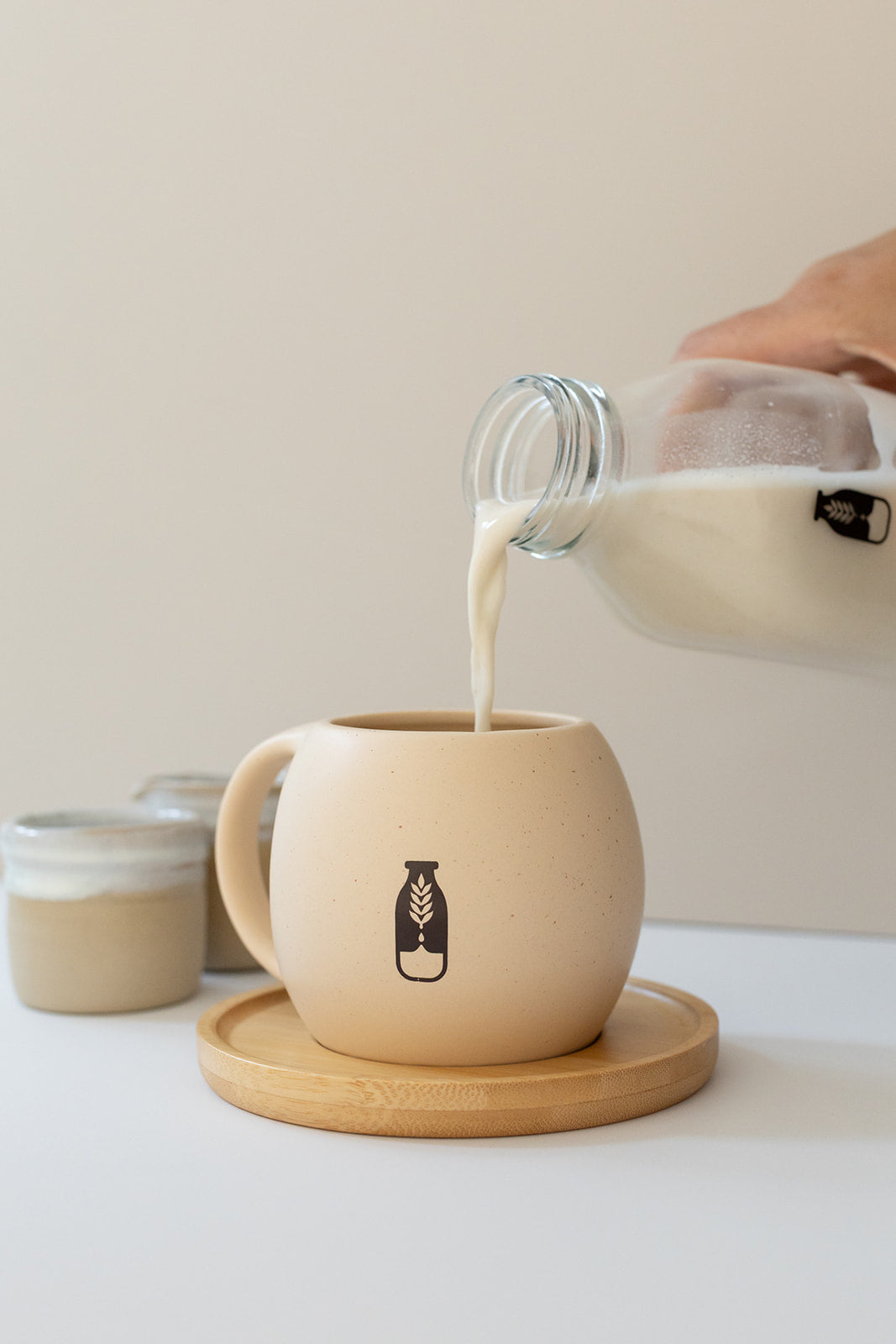Enjoy your favourite drink in the new Mylky coffee mug. ☕ Made from high-quality ceramic, perfect for your morning plant milk latte or afternoon tea. Comes with a small round wooden plate – ideal for resting your mug or serving a little treat on the side.